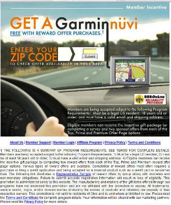 This is clear misrepresentation - their Google ad and the web landing page lead you to believe that you can get a Garmin Nuvi GPS for free. Only in the fine print do their terms state you must successfully complete several offers, which include signing up for and using a new credit card and or taking out a loan. Somehow, we suspect neither of those offer the best rates!